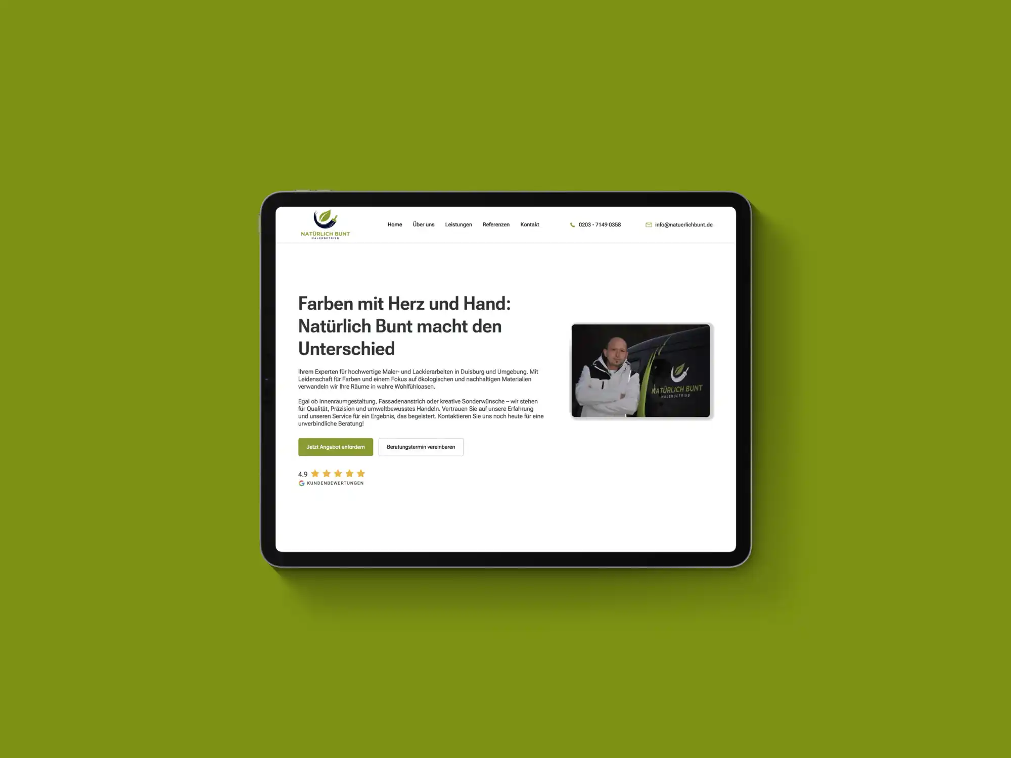 Für unseren Kunden, den Malerbetrieb Natürlichbunt aus Duisburg, haben wir eine moderne und benutzerfreundliche Website entwickelt, die nicht nur optisch, sondern auch technisch überzeugt. Natürlich Bunt ist der Experte für hochwertige Maler- und Lackierarbeiten in Duisburg und Umgebung. Mit Leidenschaft für Farben und einem Fokus auf ökologische und nachhaltige Materialien verwandelt das Team Räume in echte Wohlfühloasen.